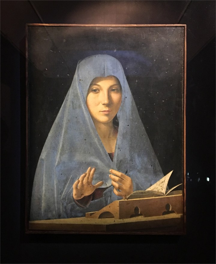 それにアントネッロの作品のなかでもっとも著名で、今回の展示のメインビジュアルになっている《受胎告知の聖母》。これもまた一部屋に一枚のみの贅沢展示で、至近距離から観察しながら、じっくり大天使ガブリエルの気分に浸ることができる。